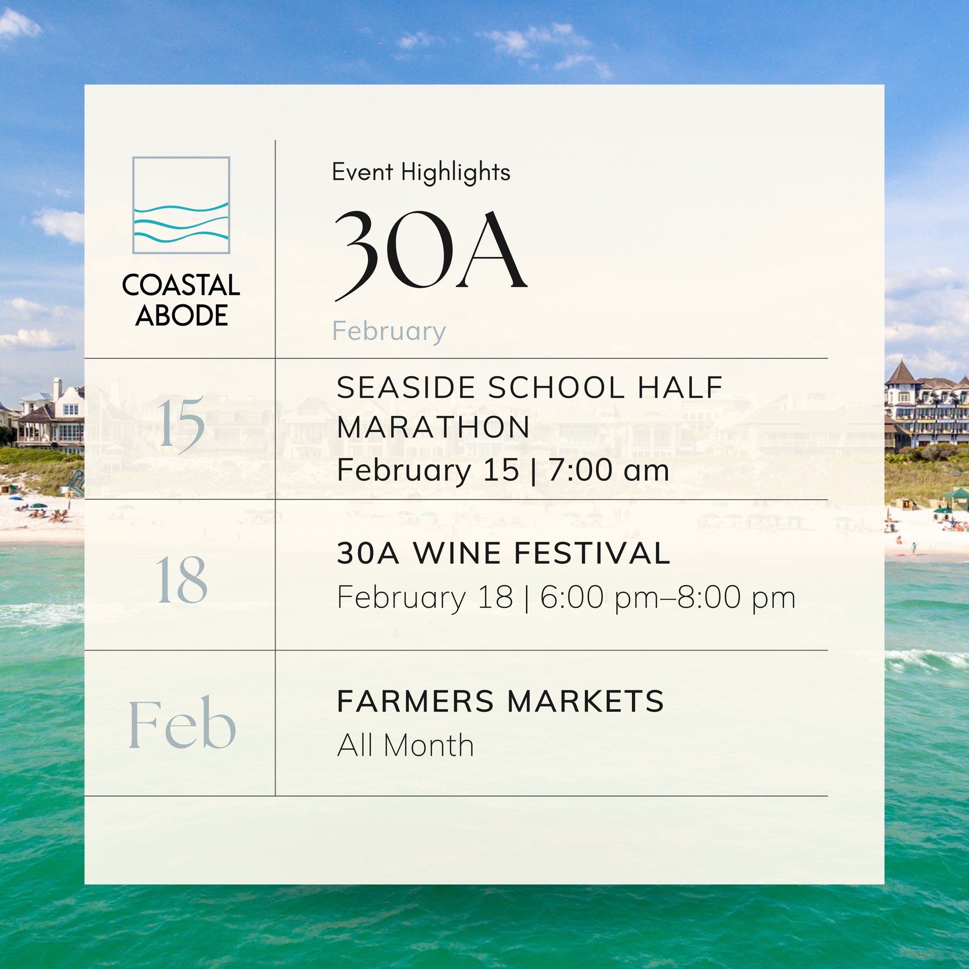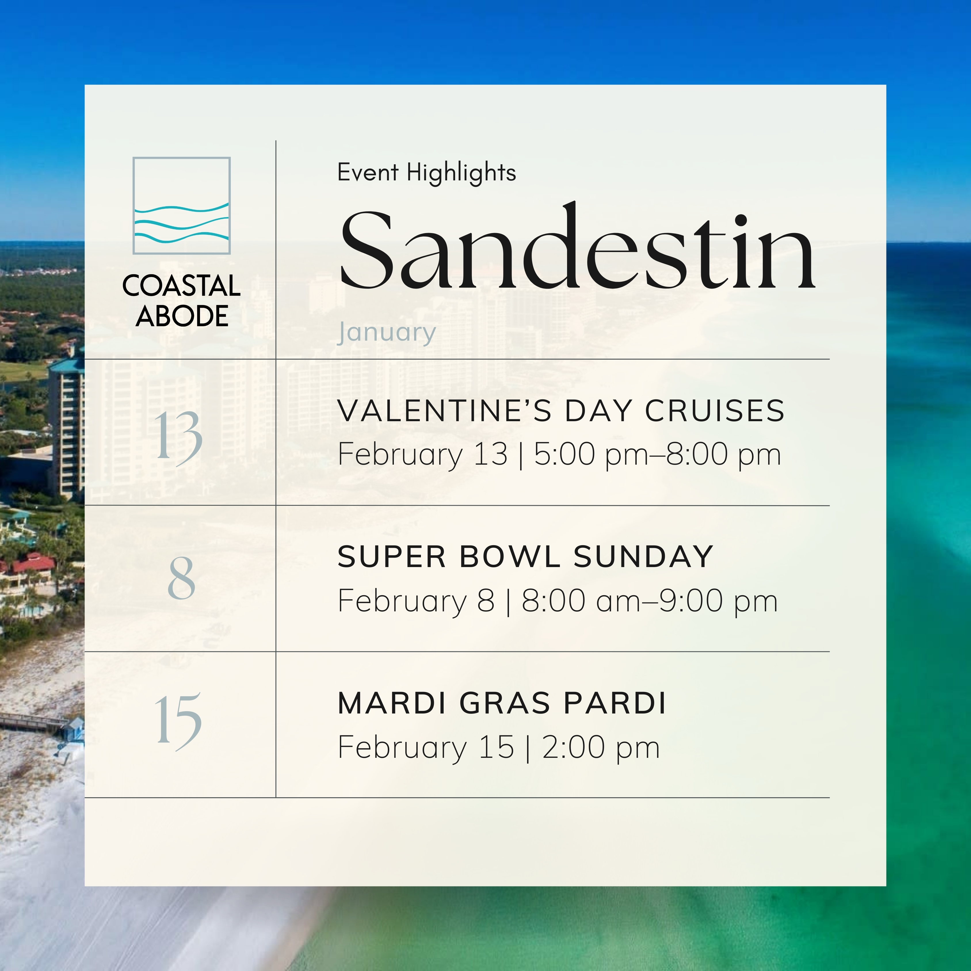 Whether you’re planning a weekend getaway, settling in for the season, or simply looking for new ways to enjoy where you live, February offers something for everyone along the Emerald Coast. These events are a reflection of the community, culture, and coastal charm that define Destin, 30A, and Sandestin. Mark your calendar, gather your friends and family, and make the most of this beautiful time of year — because there’s always something happening just steps from the shoreline.
