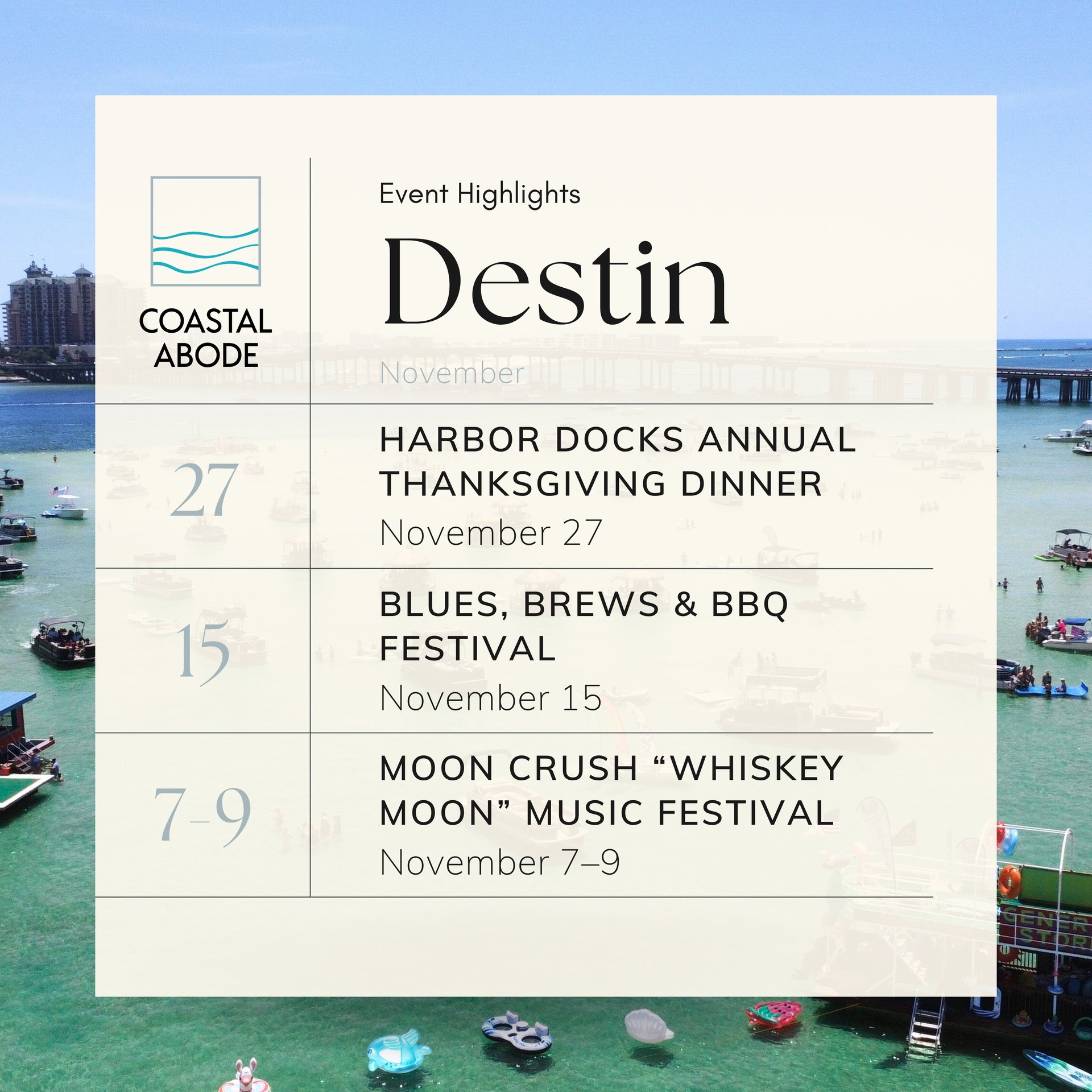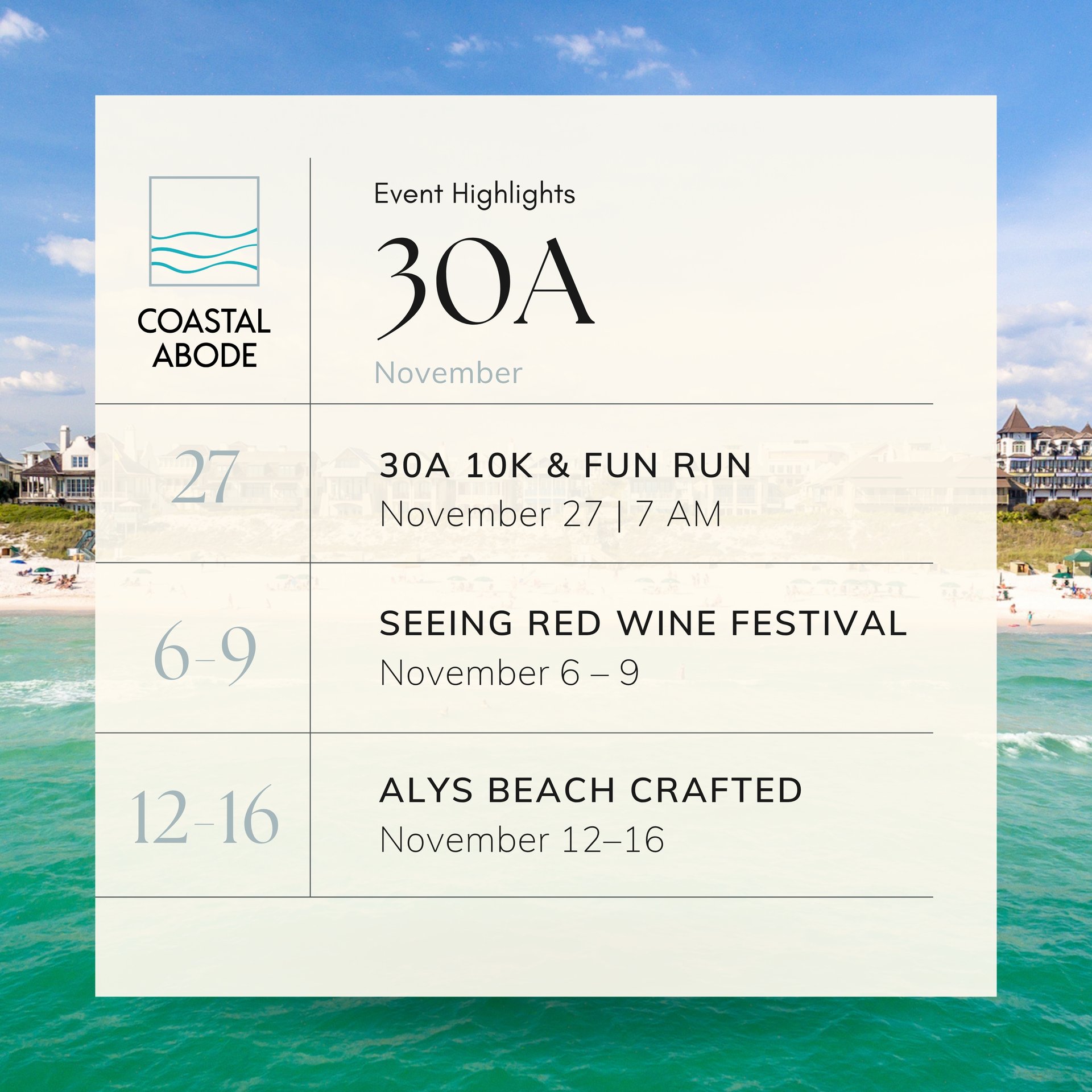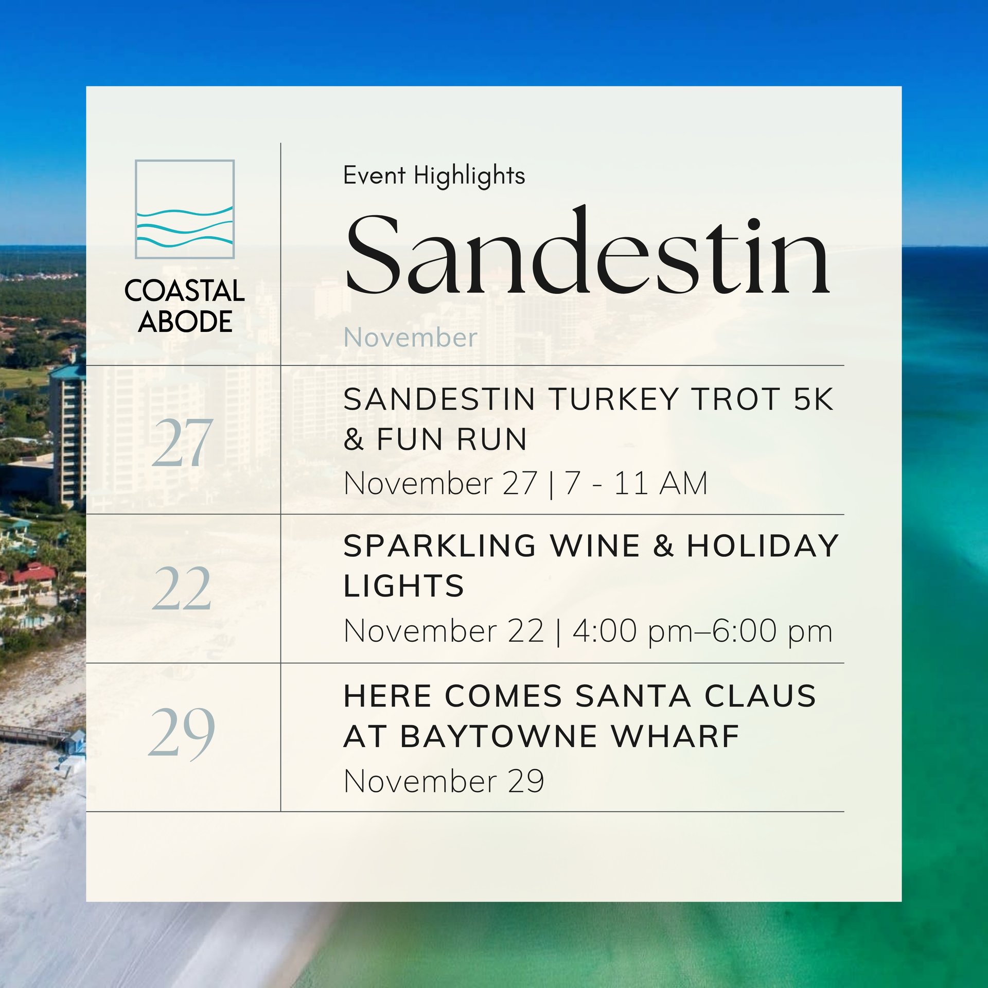 As autumn rolls into the holidays, the Emerald Coast shines a little brighter. November brings community traditions, live music, and seaside celebrations that set the tone for the most wonderful time of the year. Wherever you find yourself — from Destin’s harbor lights to the quiet charm of Rosemary Beach — take time to savor the season and the beauty that surrounds you.
