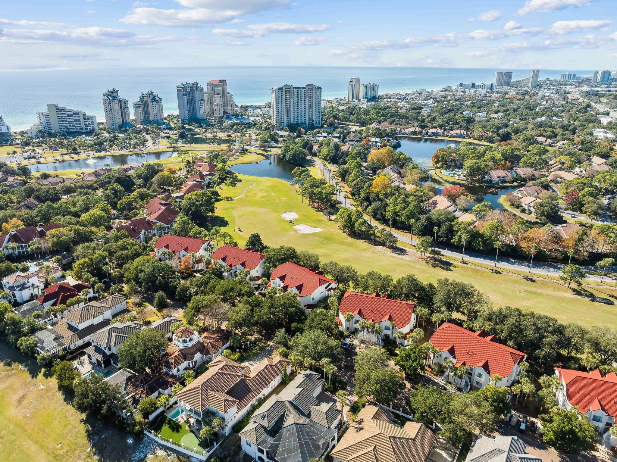 Beautifully renovated and thoughtfully designed, this 3-bedroom, 3-bath residence is nestled within the beachside enclave of Tivoli by the Sea inside the gated Sandestin Golf and Beach Resort. Offered fully furnished, this first-floor condo delivers effortless coastal living with refined finishes and a spacious, single-level layout. Step inside to an open floor plan where long-plank porcelain tile flooring flows seamlessly throughout, extending onto the screened-in patio. The kitchen is both functional and inviting, featuring a gas range, quartz countertops, stainless steel appliances, an extra-wide farmhouse sink, cherrywood cabinetry, and bar seatingperfect for casual gatherings or entertaining. A well-appointed wet bar enhances the space with a deep stainless prep sink, wine cooler, beverage cooler, and ice maker.Each bedroom is outfitted with custom California Closets, providing exceptional storage, while the bathrooms showcase quartz countertops, paneled cabinetry, and spa-inspired rain shower heads. Additional updates include a new HVAC system installed in August 2021, a building roof replacement in 2022, and fresh exterior stucco paint completed in 2023.The screened patio offers peaceful golf course views and is ideal for relaxing or entertaining, complete with a custom bar topped with limestone. The unit also includes a dedicated golf cart parking space with an electrical outlet for convenient charging, along with an owner's storage closet featuring custom heavy-duty steel shelving.Residents enjoy exclusive beach access, a private Tivoli owners' pool, access to two additional Sandestin Owners Association pools, four championship golf courses, tennis courts, a full-service marina, and multiple spa options. Miles of walking and biking paths, kayak and bike rentals, and a convenient tunnel beneath Highway 98 provide seamless access between the beachside and bayside of the resort. Just moments away, The Village of Baytowne Wharf, Grand Boulevard, and The Market Shops offer a vibrant mix of dining, shopping, entertainment, live music, and family-friendly activities.
